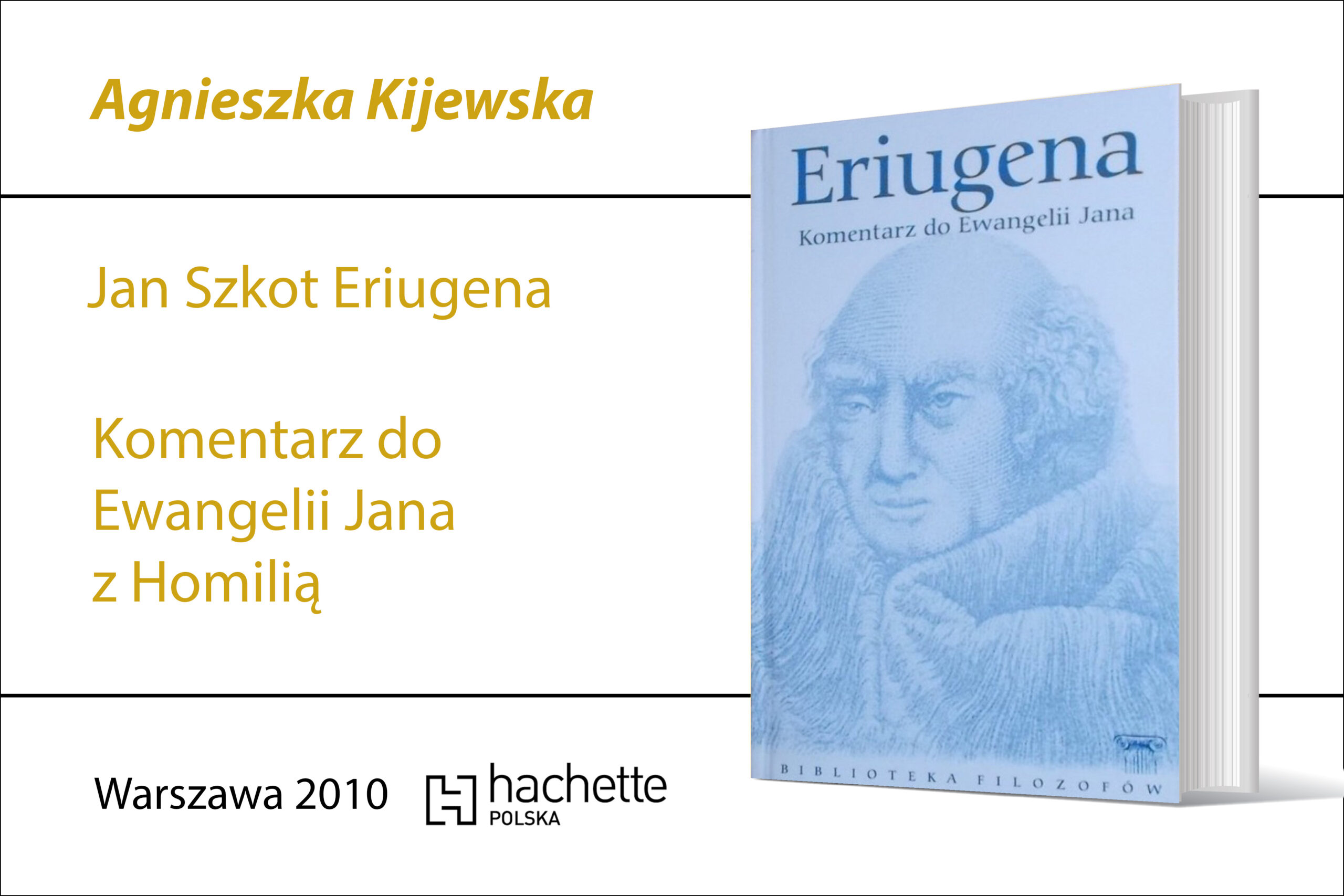 Jan Szkot Eriugena, Komentarz do Ewangelii Jana z Homilią, Kęty 2000; II -wydanie, Wydawnictwo DeAgostini- Altaya, Warszawa 2003; III wydanie w serii “Biblioteka Filozofów”, Wydawnictwo Hachette, Warszawa 2010; tłumaczenie, wstęp i przypisy Agnieszka Kijewska